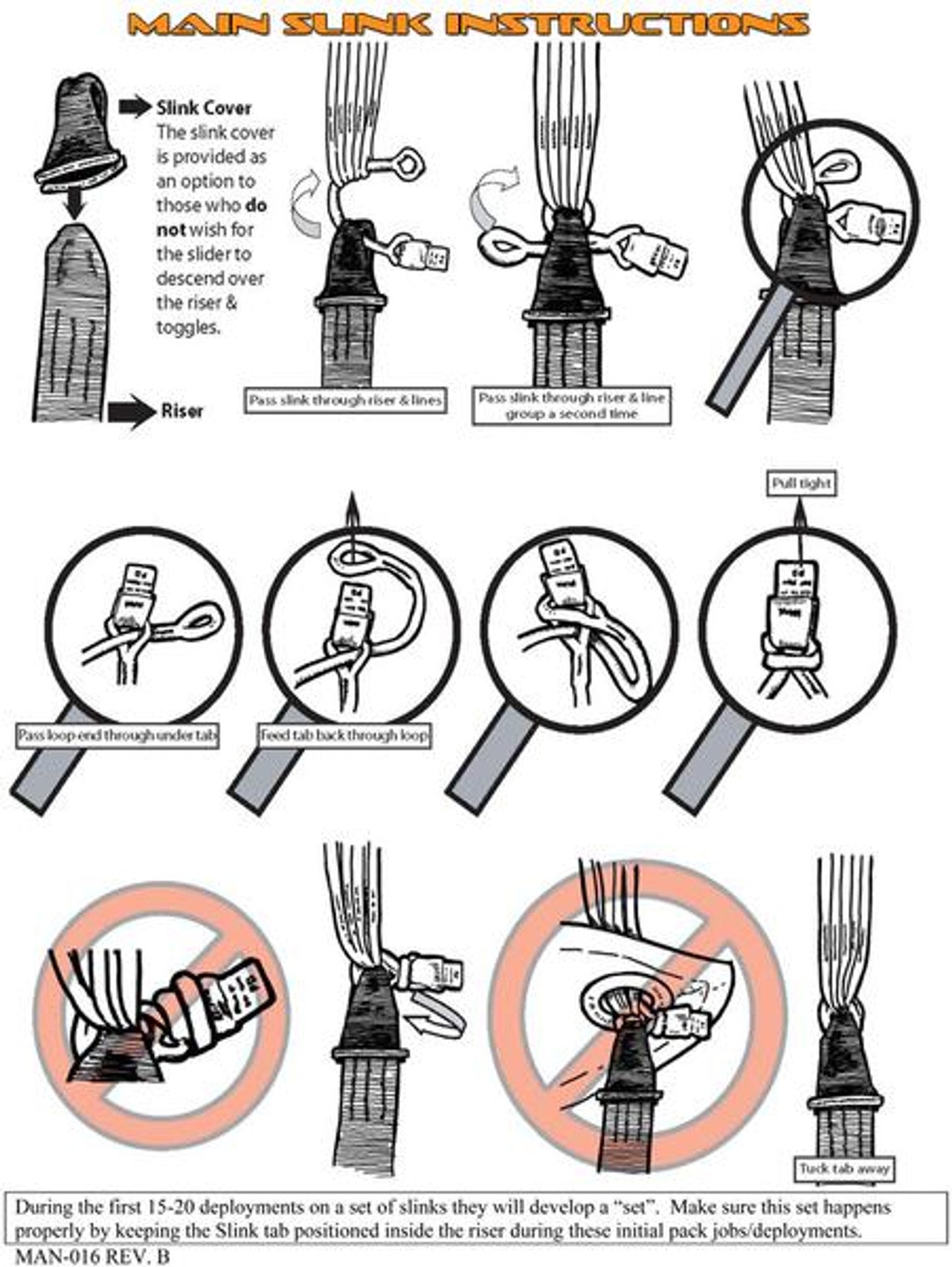 Slinks reduce bulk at the riser-to-line connection and eliminate the need for metal hardware, helping improve pack volume and line layout inside the reserve container. The SR1 version is built to meet reserve system load and strength requirements when installed and maintained correctly.